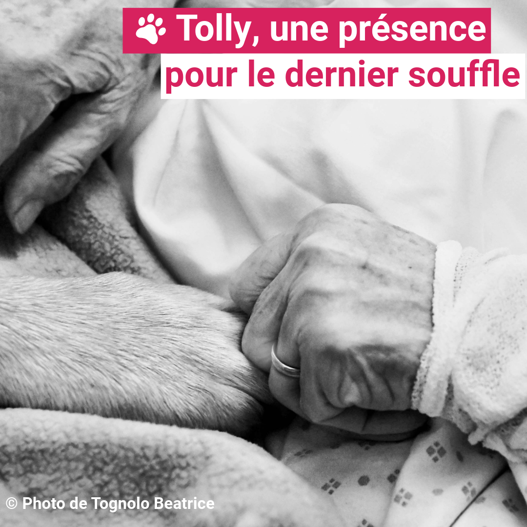 Tolly s’allonge près de lui et pose sa patte sur la main d’Émilie. Comme pour relier ces deux êtres dans un même geste de chaleur et de présence.
