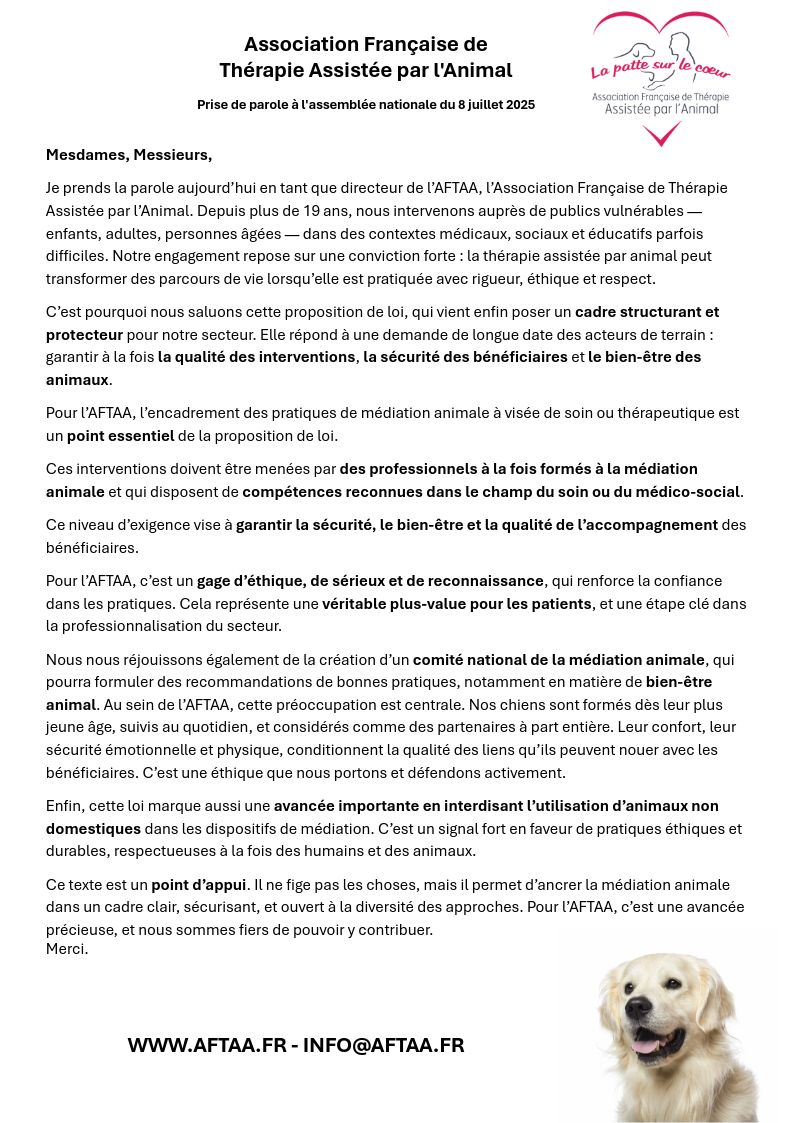 Je prends la parole aujourd’hui en tant que directeur de l’AFTAA, l’Association Française de Thérapie Assistée par l’Animal. Depuis plus de 19 ans, nous intervenons auprès de publics vulnérables — enfants, adultes, personnes âgées — dans des contextes médicaux, sociaux et éducatifs parfois difficiles. Notre engagement repose sur une conviction forte : la thérapie assistée par animal peut transformer des parcours de vie lorsqu’elle est pratiquée avec rigueur, éthique et respect.
